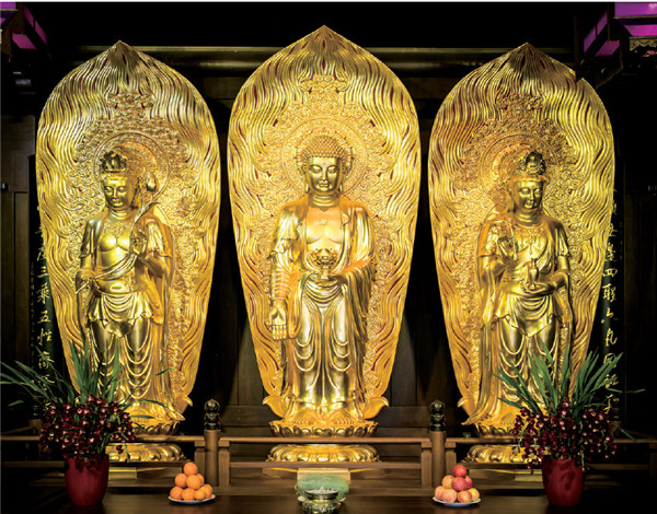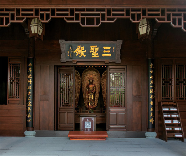 The Hall of the Holy Triad is dedicated to Amitabha Buddha in the middle, and Avalokiteshvara Bodhisattva on the right, Mahasthamaprapta Bodhisattva on the left.