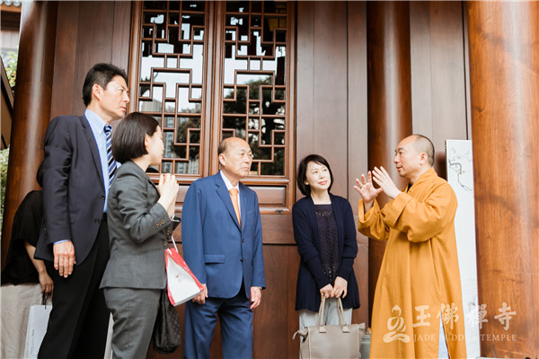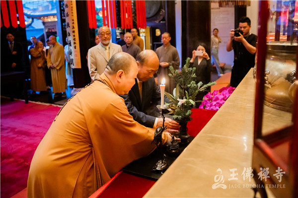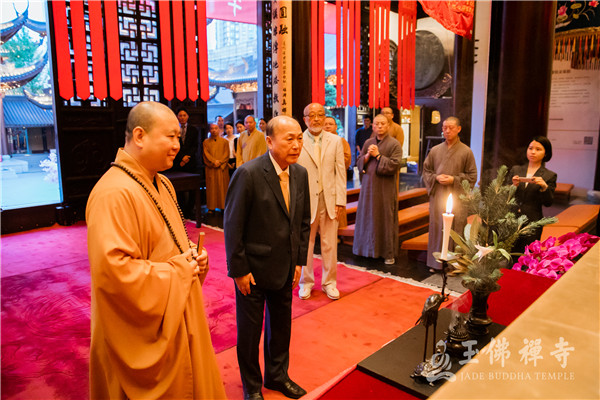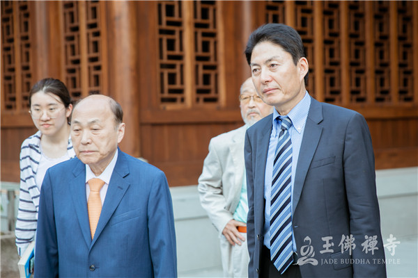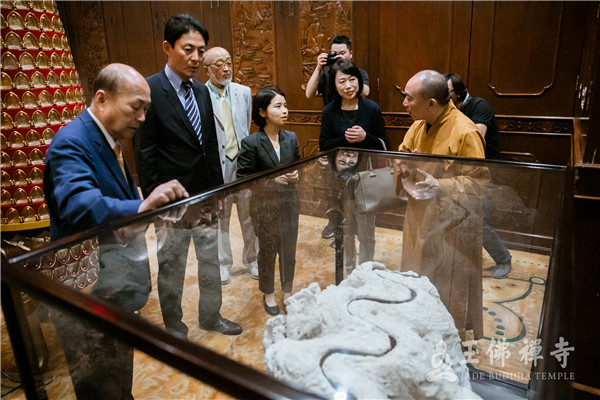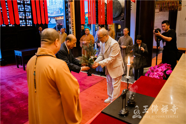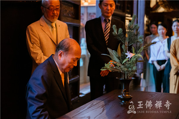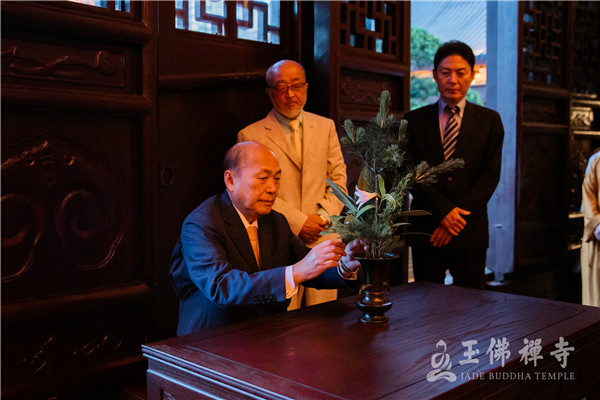 池坊专永家元一行,首先参观了寺院的各处殿堂,并瞻仰了精美的玉佛、卧佛、如意轮观音等圣像。随后,池坊专永家元与本寺方丈觉醒大和尚就中日两国佛教的发展与民间文化艺术的交流进行了友好交谈。