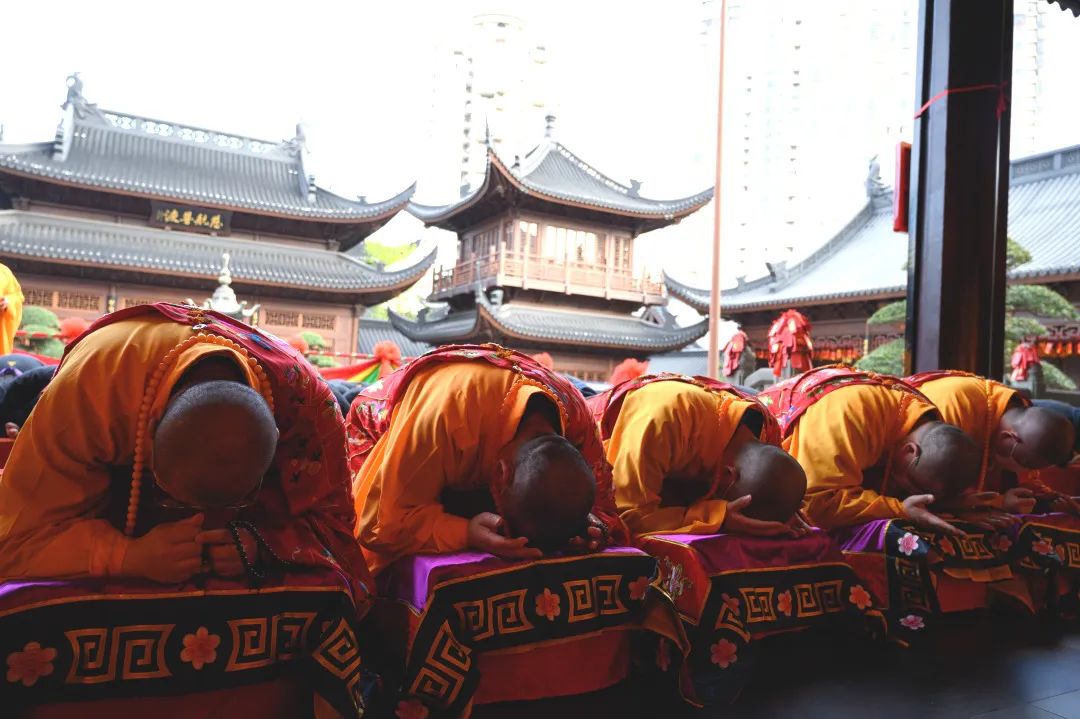 其后,主法法师领众行至往生堂,齐诵《往生咒》等,称念“阿弥陀佛”,并在往生牌位前洒净、上香、礼拜。为超荐往者,奉请地藏菩萨等,引功德主的亲属亡魂及各种孤魂,赴此次焰口法会。