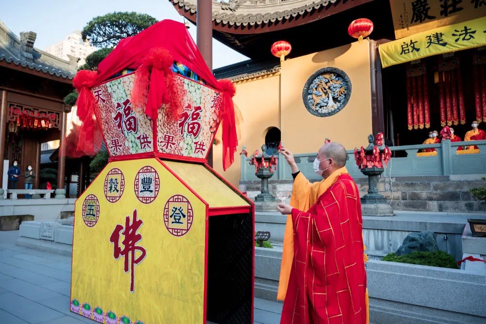 告赦仪式刚刚结束,清晨6时,大雄宝殿外举行隆重的供天仪式。