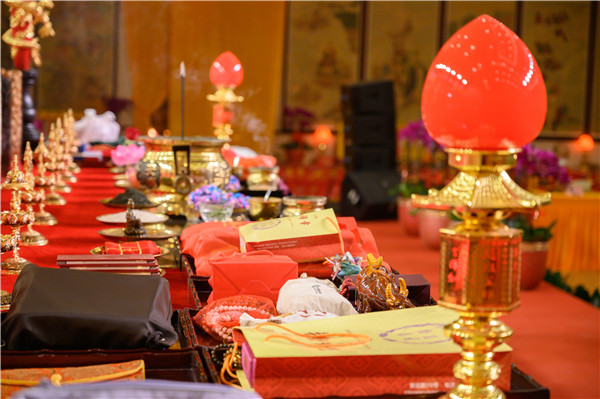 上午8时,水陆内坛敬设香、花、灯、涂、果、乐等六尘妙供,礼请上海玉佛禅寺监院、寺务处主任长春法师主法,举行庄严隆重的供上堂仪式。