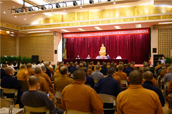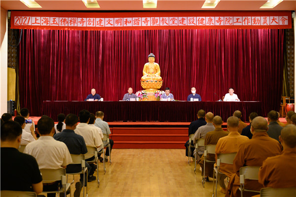 2021年8月10日中午12点,玉佛禅寺全体法师、员工在觉群二楼召开“2021 年上海玉佛禅寺文明和谐寺观教堂、建设健康单位创建动员大会”,玉佛禅寺寺务处领导等6位主任,普陀区委统战部付部长,区民族宗教办公室主任蒲雪峰参加会议。
