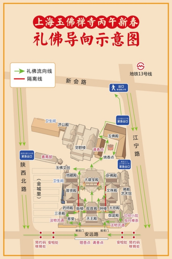 新春期间,来上海玉佛禅寺礼佛祈福,从安远路、江宁路路口或安远路口、陕西北路路口有序排队,出示并现场核销预约入寺二维码后,配合现场引导有序入寺。