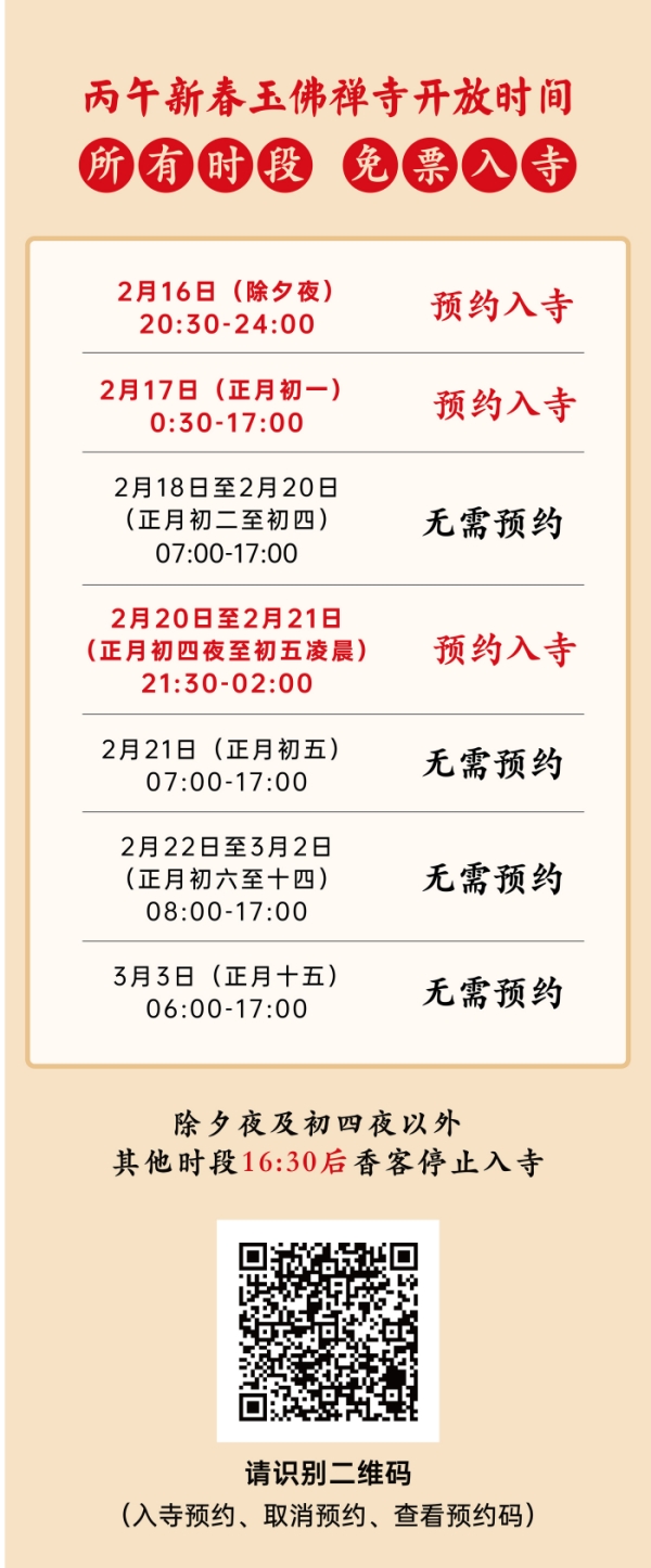 请十方善信在预约成功后,于预约时间内从安远路170号入寺,出示预约码,配合安检、有序入寺,同祈善愿,共迎新年!