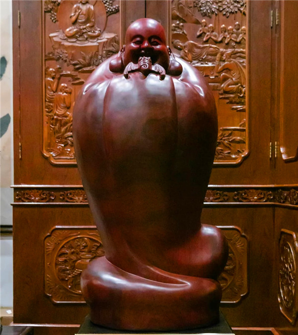 另一尊为红檀木材质的弥勒菩萨像,佛像造型圆融,线条流畅。