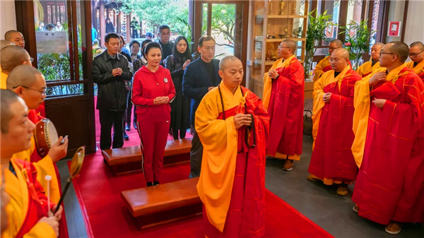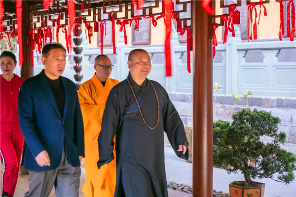 随后,熊贤林、闵丽华夫妇一行在寺务处副主任体廷法师的陪同下,来到寺院每一个殿堂虔诚礼拜。