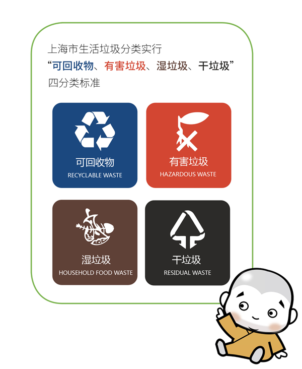 上海市的生活垃圾目前分为四类,分别是可回收物、有害垃圾、湿垃圾和干垃圾。四分类是当下最能匹配末端生活垃圾实际处理情况的标准,也是在向社会广泛征求意见后确定下来的。