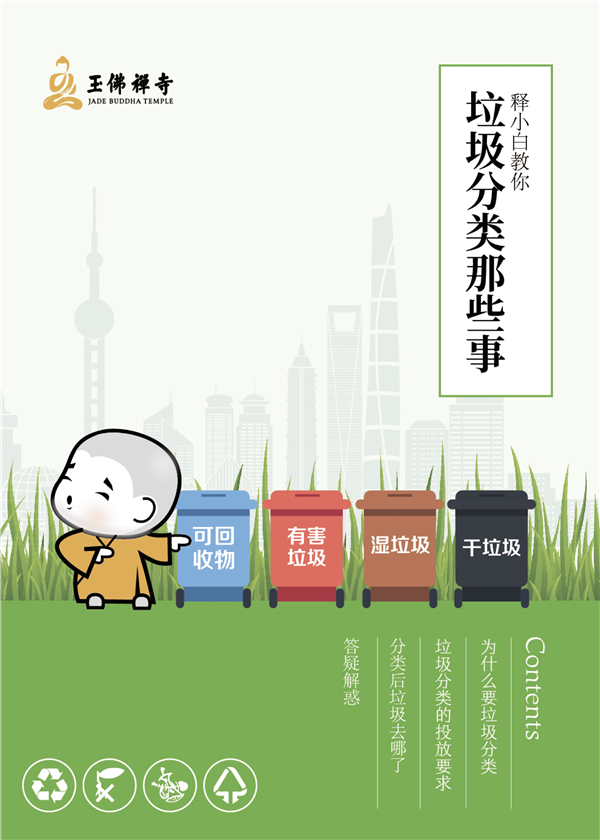 上海玉佛禅寺作为都市寺院,每年接待大量海内外信众和游客,是沪上知名的佛教道场。禅寺以“文化建寺,教育兴寺”为理念,以弘扬正法、净化人心、服务社会为己任,积极响应政府号召,将“垃圾分类”落到实处,为促进环境保护、增加资源的回收再利用而不断努力,同时为生态文明建设贡献力量。